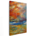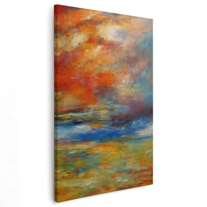 Introducing the mesmerizing canvas art print, 'Colorful Horizon Embrace,' a captivating masterpiece that transports viewers into a world where the sky and earth converge in a symphony of vibrant colors, evoking a sense of awe and wonder. The artwork's focal point is the sky, ablaze with a breathtaking palette of fiery oranges, deep reds, and soft yellows, reminiscent of a dramatic sunset painting a celestial masterpiece. Below, the canvas transitions into cooler tones of blue and green, portraying either a tranquil sea or a vast meadow, creating a striking contrast with the warm hues above, blending harmoniously in a dynamic and flowing display of nature's beauty.