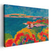 Introducing 'Colorwaves Drenched Horizon: A Vivid Seascape in Bold Colors,' a mesmerizing canvas art print that encapsulates the vibrant and dynamic beauty of a coastal landscape in a riot of colors. This artwork portrays a stunning seascape where the deep blue ocean merges with fiery reds and lush greens of the coastal surroundings, creating a harmonious yet visually striking composition.