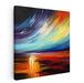 The painting's focal point is the expansive sky, alive with swirling colors that transition from deep blues and purples to bright yellows and oranges, evoking a sense of cosmic energy and celestial wonder. The artist's skillful blending of these hues creates a fluid composition full of vitality and motion. Beneath this celestial spectacle, a reflective body of water mirrors the rich reds and golds of the horizon, intensifying the scene's warmth and vibrancy.
