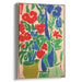 Introducing 'Crimson Wave Blossom,' a captivating abstract canvas art print that bursts with a kaleidoscope of colors and shapes, celebrating the essence of a lively floral arrangement. This vibrant piece showcases a variety of bold, abstract flowers in primary hues of red and blue, complemented by lush green leaves, all depicted in a simplified, almost naive style that accentuates their forms and colors over intricate details.