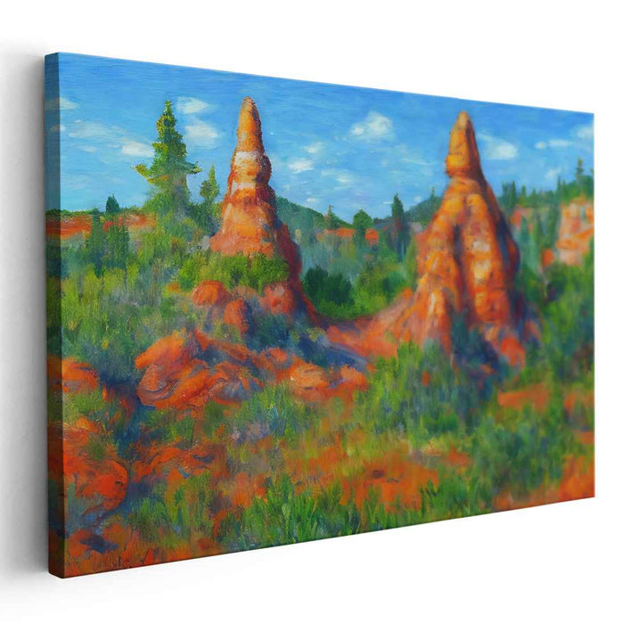 The primary color of striking red-orange breathes life into the majestic rock formations, complemented by lush greens of the vegetation, deep blues of the sky, and subtle hints of yellow and brown, adding layers of depth and realism to the composition. The artist's style resonates with the Impressionist movement, focusing on capturing light and atmosphere in the moment with bold and expressive brushstrokes that evoke texture and movement within the landscape.