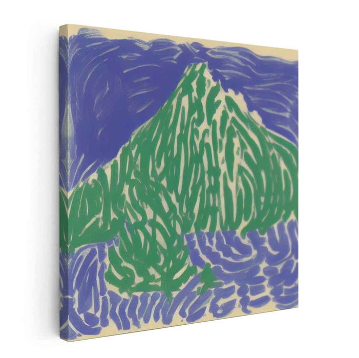 Immerse yourself in the vibrant and refreshing essence of 'Emerald Peak: A Lively Expressionist Mountain Portrait'. This captivating canvas art features a bold depiction of a mountain, rendered in striking shades of green against a vivid blue background. The mountain, with its dynamic and somewhat abstract brushstrokes, conveys a sense of movement and vitality, making the landscape come alive.