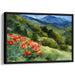 Step into the tranquil beauty of 'Enveloped in Scarlet Petals: Lush Landscape with Crimson Blossoms,' a mesmerizing watercolor canvas art piece that transports the essence of nature directly into your living space. This artwork skillfully captures the abundant greenery of undulating hills, cloaked in a spectrum of emerald, olive, and jade tones, cascading into mist-kissed, cerulean mountains in the far-off backdrop.