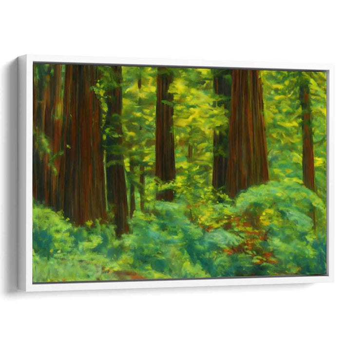Introducing "Ephemeral Woods," a mesmerizing canvas art print that transports viewers into the heart of a tranquil forest, where majestic trees stand tall, enveloping the scene in a serene embrace. This captivating artwork captures the essence of a dense woodland, showcasing a harmonious blend of rich browns, deep greens, and vibrant foliage that carpets the forest floor.