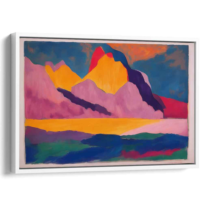 The piece showcases a series of jagged and smooth mountain silhouettes that soar dramatically against a vivid sky. The mountains, painted in a striking palette of magenta, deep violet, fiery red, and bright yellow, exude warmth and vitality. Contrasting the lively mountains, the foreground features a lush blend of greens and blues, hinting at a reflective water body that adds a serene counterbalance to the energetic peaks.