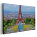 The focal point of this artwork is the Eiffel Tower, depicted in a bold and captivating red hue that starkly contrasts with the verdant greenery of the park that surrounds it. The background reveals a softly blurred Parisian skyline, creating a sense of depth and distance that enhances the overall composition. The sky, painted in soothing gradients of blues, instills a sense of peace and tranquility in the viewer.