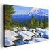 Introducing 'Ethereal Summit Impressions,' a mesmerizing landscape canvas art print that immerses viewers in a serene winter scene. This captivating artwork showcases a majestic snow-capped mountain as the focal point, standing tall in shades of white and light blue against the backdrop of a clear, azure sky. The middle ground is adorned with lush pine trees, their vibrant green foliage contrasting beautifully with the snowy foreground.