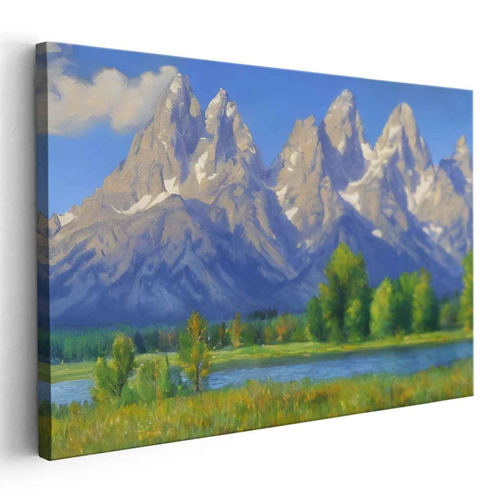 Introducing 'Ethereal Summit Silence: Serene Mountain Landscape Canvas Art Print,' a mesmerizing portrayal of a grand mountain range, reminiscent of the majestic Grand Tetons, set against a backdrop of a clear azure sky. This captivating artwork skillfully captures the rugged beauty of towering peaks dusted with glistening snow, surrounded by lush green meadows and a tranquil, reflective body of water.