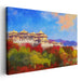 Introducing "Ethereal Tranquil Templescape," a mesmerizing canvas art print that transports viewers to an ethereal landscape where traditional architecture harmonizes with the vibrant hues of nature. This captivating artwork features majestic, golden-roofed buildings, reminiscent of ancient temples or palaces, set amidst a lush, colorful landscape bursting with the vivid reds, oranges, and greens of autumn foliage.