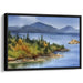 The artist skillfully portrays a rich tapestry of colors, from the vibrant greens of the flourishing foliage to the warm autumnal tones that infuse the scene with a cozy feel. The serene lake's reflective waters mirror the azure sky above, harmonizing a palette of blues, greens, browns, yellows, and purples, creating a visual symphony that exudes peace and tranquility.