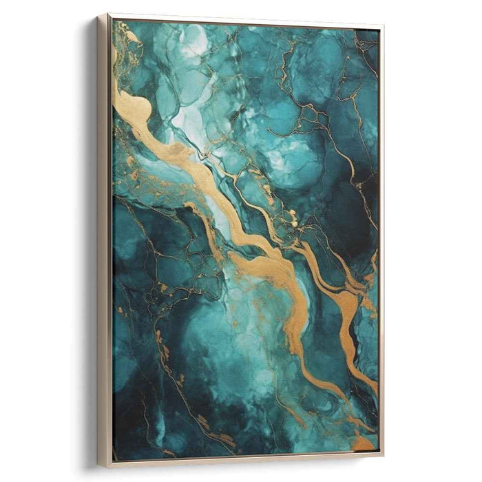 The canvas is adorned with veins of luxurious gold, elegantly swirling through the composition, creating a striking contrast against the deep teal backdrop. This opulent touch adds a sense of sophistication and elegance to the piece, elevating its visual appeal and creating a mesmerizing interplay of colors.
