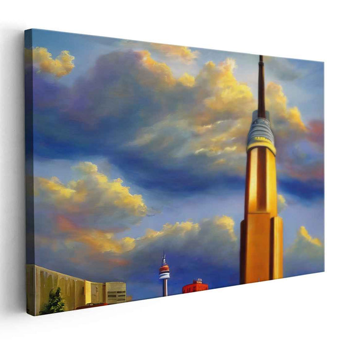 Introducing 'Golden Skyline: Majestic Skyscraper at Sunset,' a captivating cityscape canvas art print that transports viewers into a world where a towering skyscraper commands attention against a backdrop of swirling, dramatic clouds. This stunning artwork captures the essence of grandeur and inspiration, set amidst a vibrant, multi-colored sky that hints at the beauty of a sunset or sunrise.