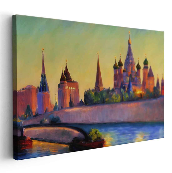 Introducing 'Golden Twilight Over Moscow,' a mesmerizing canvas art print that captures the enchanting beauty of the iconic Moscow skyline as night falls, enveloping the city in a golden glow of twilight. This artwork showcases a spellbinding panorama of the Moscow Kremlin, prominently featuring the world-famous Saint Basil's Cathedral with its vibrant onion domes that pierce the dusky sky, creating a scene of unparalleled grandeur.