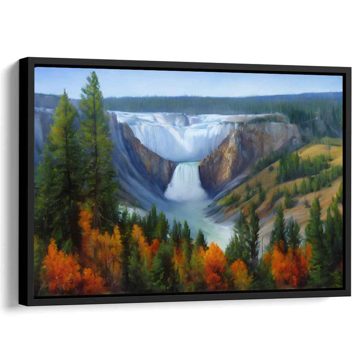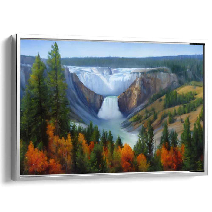 Introducing 'Golden Whispers Among Quiet Trees: Autumnal Splendor in a Serene Landscape,' a captivating canvas art print that transports you to a world of natural grandeur and tranquil beauty. This stunning artwork portrays a majestic waterfall cascading down a rugged cliff amidst a vibrant autumn landscape, creating a scene of breathtaking splendor and serenity.