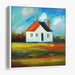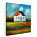 Introducing "Impressionist Harvest Retreat," a captivating Post-Impressionist homestead canvas art print that transports viewers to a peaceful and solitary house nestled in a serene landscape. The artwork features a charming house with striking white walls and a contrasting red and dark blue roof, standing out vividly against the vibrant backdrop of bold blues and greens dominating the sky and foreground.
