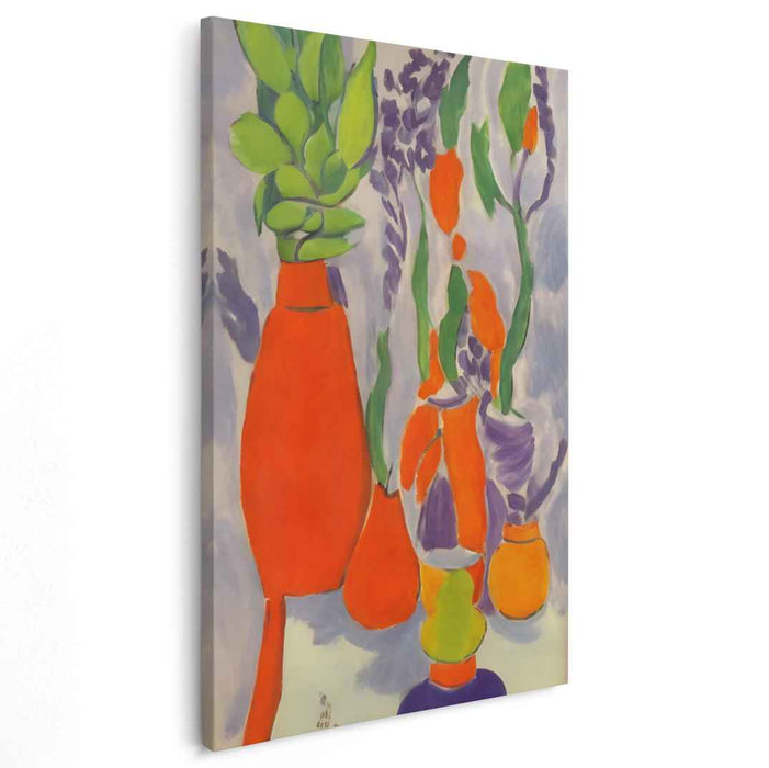 Introducing "Juicy Palette Fusion," a captivating still life canvas art print that bursts with an explosion of color and vitality, showcasing a collection of vibrant vases adorned with lush green foliage and a riot of colorful blooms. This masterful composition immerses viewers in a world of dynamic hues and textures, where each vase is a unique masterpiece of bold reds, oranges, and purples, set against a serene lavender backdrop.