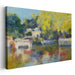 Introducing 'Lakeside Reverie: Impressionist Lakeside Vista,' a captivating canvas art print that transports viewers to a serene lakeside setting, enveloped in tranquility and contemplation. This masterful artwork showcases a lush and vibrant landscape, where a peaceful body of water mirrors the vivid colors of the surrounding flora and architectural beauty.