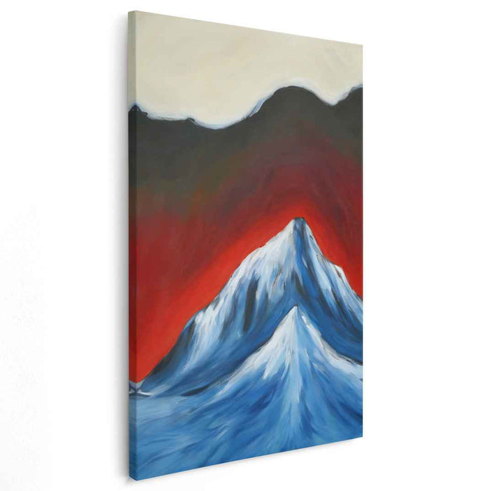 Above, the sky transitions from a deep, fiery red to a soft, calm beige, hinting at a turbulent yet breathtaking atmospheric event. The interplay of colors, from the cool icy blues of the mountain to the warm reds of the sky, creates a dynamic contrast that amplifies the artwork's intensity. The deep blue primary color instills a sense of calmness and depth, while the vibrant secondary colors of red, white, and beige infuse the scene with energy and movement, making it a captivating focal point in any space.