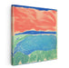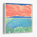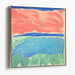 The canvas unfolds a breathtaking panorama where a vast sky painted in radiant coral pink gracefully transitions into a creamy peach, reminiscent of a tranquil sunset. Below, the deep blues of the sea undulate with soothing waves, harmonizing with the lush green foliage that adorns the foreground, infusing the scene with vibrant life. The artist's use of gentle gradients and soft forms creates a dream-like atmosphere, offering a serene escape into a tranquil landscape.