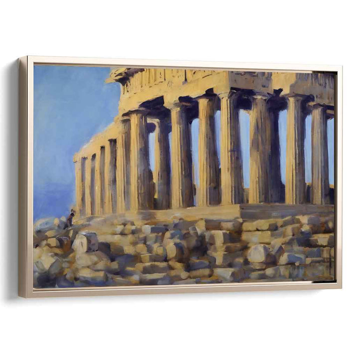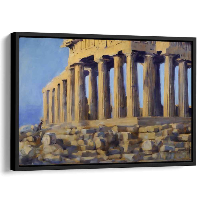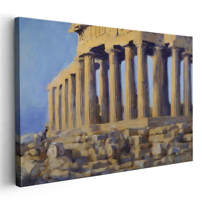 Introducing "Melodic Homage: A Classical Tribute," a mesmerizing landscape canvas art that transports viewers to the ancient world of classical antiquity, capturing the majestic beauty of an iconic Greek temple, likely the Parthenon, basking in the golden light of the setting sun. This captivating artwork immerses viewers in a scene where the towering Doric columns of the temple loom tall and proud, casting dramatic shadows on the ancient stone steps and rubble below.