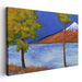 The foreground comes alive with the vibrant hues of autumn, as trees painted in shades of orange and yellow signal the changing of the seasons. These colors not only add warmth to the scene but also evoke a sense of coziness and nostalgia, making the artwork inviting and comforting.