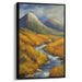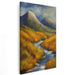 Introducing "Misty Peaks Abound," a mesmerizing landscape painting that immerses viewers in a tranquil autumnal setting, where nature's brilliance shines through vibrant hues and serene beauty. This captivating artwork showcases a picturesque valley embraced by two grand mountains, their rocky peaks basking in gentle light that starkly contrasts with the deep, dramatic sky above.