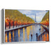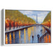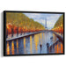 The harmonious blend of yellows, oranges, and reds from the street lamps' reflection contrasts beautifully with the cooler tones of the sky and water. Lush green and orange foliage add vibrancy and warmth to the scene, creating an inviting and nostalgic atmosphere. The visible brush strokes and impressionistic style breathe life into the painting, focusing on the interplay of light and color rather than intricate details, allowing viewers to almost feel the cool breeze and hear the gentle lapping of the water.