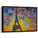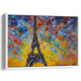 The artist skillfully employs a palette knife technique to create a textured masterpiece, blending bright yellows and oranges seamlessly into deep blues and purples. These colors dance harmoniously, infusing the painting with movement and vitality, enhancing the prominence of the Eiffel Tower against the backdrop. Hints of red and green add depth and intricacy, creating a visual feast for the eyes.
