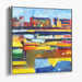 Executed in a distinctly abstract style, the painting showcases confident brushstrokes and a dynamic layering technique that conveys both depth and movement. This lively and energetic composition evokes the vibrant essence of a waterfront bustling with life.