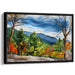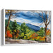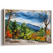 The rich, warm tones of the forest foliage harmonize with the cool, deep blues of the mountains, creating a captivating visual contrast that adds depth and vibrancy to the composition. The sky above, a dramatic blend of azure and white with wisps of clouds, imbues the scene with a sense of tranquility and vastness, enhancing the overall serenity of the artwork.