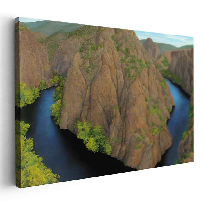 Introducing "Natural Perspective," a breathtaking realistic landscape canvas art print that transports viewers to a majestic canyon adorned with towering cliffs and a tranquil river, capturing the essence of nature's grandeur and tranquility. This captivating artwork meticulously portrays the rugged texture of the cliffs, embellished with patches of lush greenery, hinting at a vibrant ecosystem thriving amidst the rocky landscape.