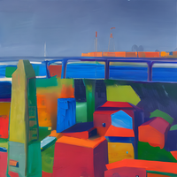 This piece showcases a distinctly modernist style with clear nods to Cubism evident in its fragmented, angular forms and bold color choices that convey depth and structure. The artist employs flat color planes and sharp lines to instill a sense of order and rhythm into the bustling harbor scene, echoing the innovative spirit of artistic pioneers like Pablo Picasso and Georges Braque.