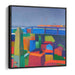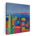 Introducing 'Oceanic Abstract Dwellings: A Modernist Interpretation of Maritime Life,' a captivating canvas art print that offers a bold and abstract take on a bustling harbor scene, showcasing a vibrant and colorful depiction of a modernist harbor. This artwork presents a stunning array of geometric shapes that come together to form a lively harbor setting, complete with buildings, docks, and a distant sailboat, all bathed in a rich blue hue representing the vast sky and tranquil sea.