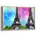 The Eiffel Tower, depicted twice in the composition, stands tall and majestic in shades of brown and black, creating a striking contrast against the colorful sky. Lush green trees at the tower's base add a touch of natural beauty and harmony to the piece. The watercolor technique's fluidity is evident in the soft transitions between colors, imparting a dreamlike and ethereal quality to the artwork.