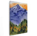 The focal point of this masterpiece is the majestic mountain, dominating the scene with its rich hues of blue and purple, accented by touches of white that suggest the glistening snow atop its peak. The background sky is a canvas of warm oranges and yellows that beautifully contrast the cool tones of the mountain, creating a visually stunning equilibrium. Below, a dense forest of evergreen trees in deep greens adds a touch of realism, grounding the composition in the serenity of nature.