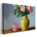 Introducing "Petals of Past Masters," a mesmerizing canvas art that encapsulates the eternal charm of a classical floral still life, evoking a sense of timeless elegance and natural beauty. This exquisite artwork showcases a vibrant bouquet of pink and white flowers, elegantly arranged in a glossy golden-yellow vase, exuding a full and lush appearance on a wooden surface. A delicate pink rose, placed beside the vase, adds a spontaneous touch to the composition, enhancing its grace and allure.