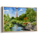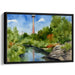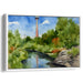 Primary colors, predominantly green and blue, dominate the scene, infusing it with a soothing sense of calm and tranquility. Subtle touches of red and orange in the foliage provide warmth and vibrancy, creating a balanced and inviting atmosphere that beckons viewers to immerse themselves in the urban oasis depicted on canvas.