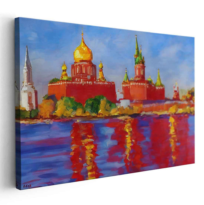 Introducing 'Reflections of Majesty,' a mesmerizing canvas art print that captures the grandeur of the iconic Moscow Kremlin reflected in the tranquil waters of the Moskva River. This vibrant artwork pulsates with a rich palette dominated by shades of red, blue, and gold, evoking a sense of historical significance and magnificence.