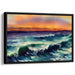 The painting portrays a vivid seascape where the ocean's waves crash against each other, illuminated by the radiant hues of the sun setting on the horizon. The sky is painted in a spectrum of colors, from deep oranges and fiery reds to soft purples and calming blues, forming a dramatic and awe-inspiring backdrop that mirrors the ocean's energy.