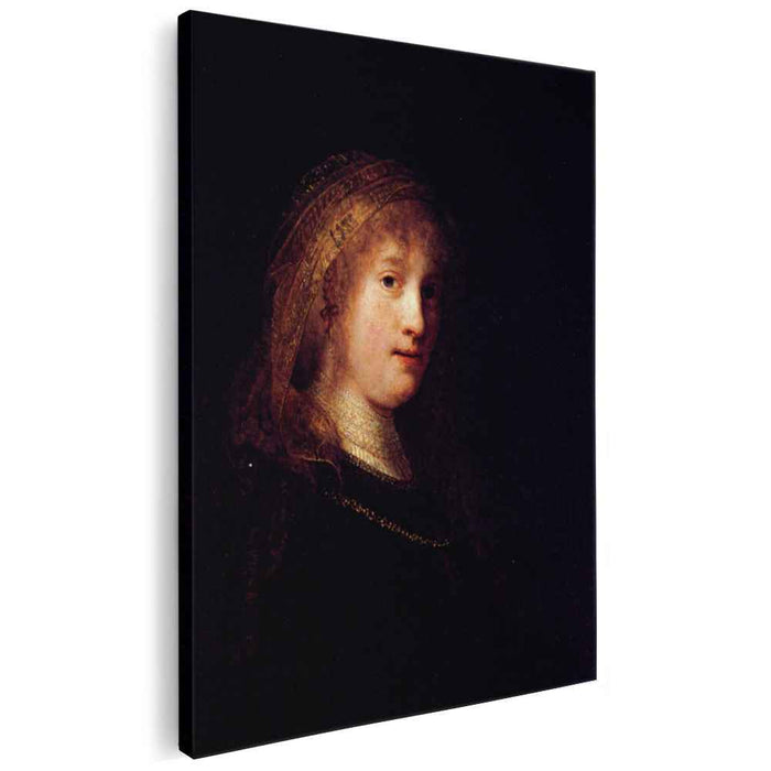 Unveil the timeless beauty of Rembrandt's iconic portrait, "Saskia Wearing a Veil." Created in 1634, during his early period, this intimate masterpiece now comes to life on high-quality canvas, inviting you into the private world of the artist and his beloved wife.