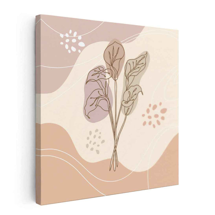The central focus of this piece is a meticulous arrangement of leaves, depicted with fine, elegant lines in earthy tones of brown and beige. These colors create a soothing and harmonious palette that emanates tranquility and calmness. Surrounding the botanical motif are abstract shapes in soft pastel hues of cream, peach, and light mauve, adding a serene yet dynamic backdrop that complements the central theme.