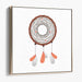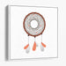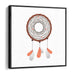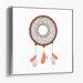 Introducing 'Serene Dreamcatcher,' a mesmerizing canvas art piece inspired by Native American culture and spirituality. This artwork features a beautifully crafted dreamcatcher, intricately woven with patterns of brown threads forming a captivating web adorned with small orange beads. Three delicate feathers in shades of soft gray and vibrant orange sway gently, symbolizing the flow of dreams and positive energy.