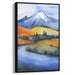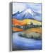 The focal point of the artwork is the stunning mountain peak, elegantly draped in mist, creating a sense of mystery and grandeur. The snowy cap of the mountain stands out against the azure sky, offering a striking contrast that draws the eye and captures the imagination. The landscape below unfolds with rolling hills painted in deep greens and bright oranges, reminiscent of the vibrant colors of autumn. A meandering river flows through the valley, its cool blue tones harmonizing with the warm earthy hues of the land.