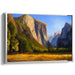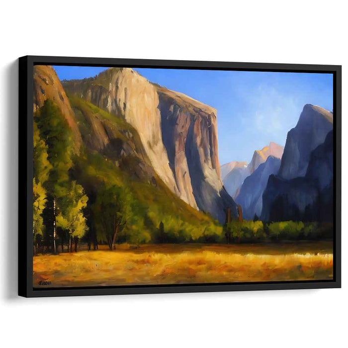 Introducing the breathtaking "Shifting Horizons," a realistic landscape canvas art print that transports viewers to the awe-inspiring beauty of a mountainous terrain reminiscent of the vistas of Yosemite National Park. This captivating artwork captures towering granite cliffs bathed in warm, golden sunlight, meticulously depicting the rugged textures of nature's grandeur.