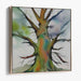 The tree's trunk and branches are brought to life with a vibrant palette dominated by primary colors like green and brown, interwoven with bursts of secondary hues such as blue, red, and yellow. This lively color combination infuses the tree with a dynamic energy, despite its lack of leaves. The background adds to the ethereal ambiance, with soft, blurred patches of color hinting at a misty, otherworldly landscape, enhancing the overall dreamlike quality of the piece.