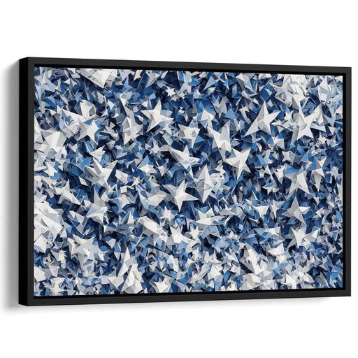 Introducing 'Stellar Arrangement,' a captivating canvas art print that bursts with a symphony of bold geometric stars against a rich, deep blue backdrop, creating a dynamic and vibrant visual experience. This artwork is a celebration of color and shape, with stars of various sizes and hues dancing across the canvas in a joyful and playful display.