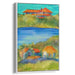 The composition of this artwork is divided into two distinct sections. The upper part features a house with a vibrant orange roof, standing out against the lush greenery of the hill. In contrast, the lower section portrays smaller structures with orange roofs nestled near the water's edge, creating a charming and picturesque scene.