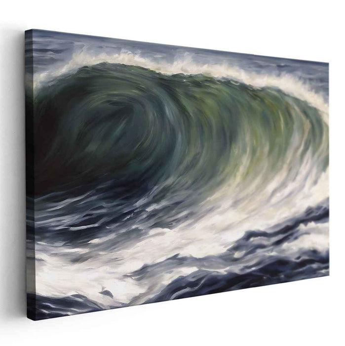 The artist's skilled brushwork uses swirling strokes to imbue the wave with a sense of imminent motion, as if it is on the brink of crashing out of the canvas. The dramatic contrast between the dark, deep blues of the ocean and the bright white of the surf heightens the intensity of the scene, drawing the viewer into the heart of the wave's power.