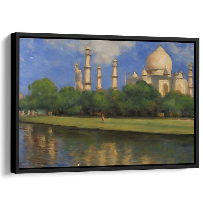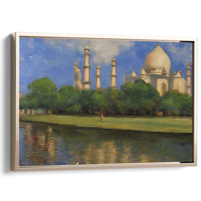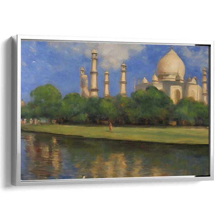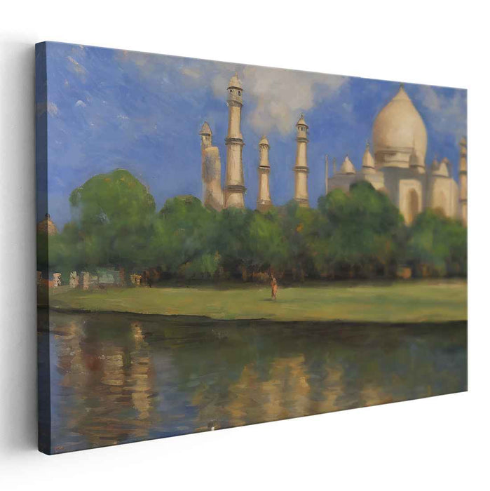 Inspired by the Romanticism movement, this landscape painting resonates with the works of celebrated artists like J.M.W. Turner and Frederic Edwin Church, who found beauty in nature and architecture. Employing techniques such as atmospheric perspective and reflective surfaces, this artwork magnifies the visual impact of the Taj Mahal and its serene surroundings.