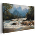 The canvas art elegantly blends earthy browns and greens to depict the rugged rocks, lush foliage, and majestic trees lining the riverbank. The misty, atmospheric background hints at either an early morning or late afternoon ambiance, where soft light filters through the trees, casting delicate reflections on the water's surface.